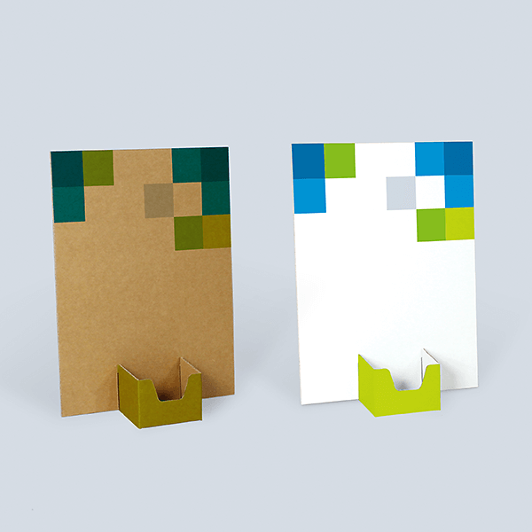 Der Ständer für Visitenkarten wird aus einem Wellkarton mit einer Stärke von 1,5 mm hergestellt und ist weiss, einseitig gestrichen oder in natürlichem braun erhältlich. Das Material ist besonders stabil und macht den Visitenkartenständer zu einem langfristig einsetzbaren Werbeträger.